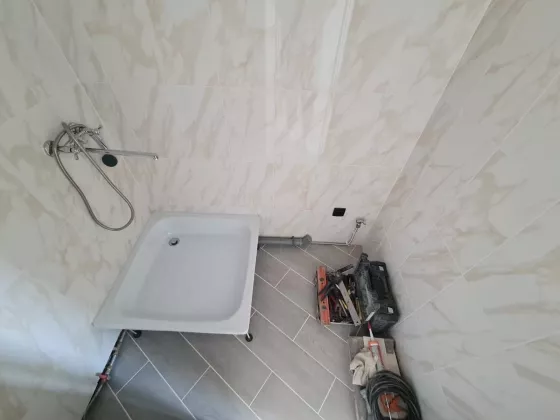 - вода и душевая установлена в самой комнате отделан керамогранитом, на потолке – натяжной потолок.