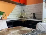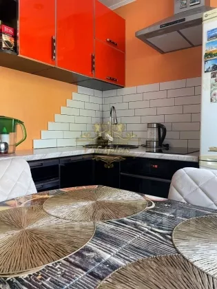 Удобная угловая кухня в оранжевых тонах,оборудована современной бытовой техникой.Отдельная обеденная зона.