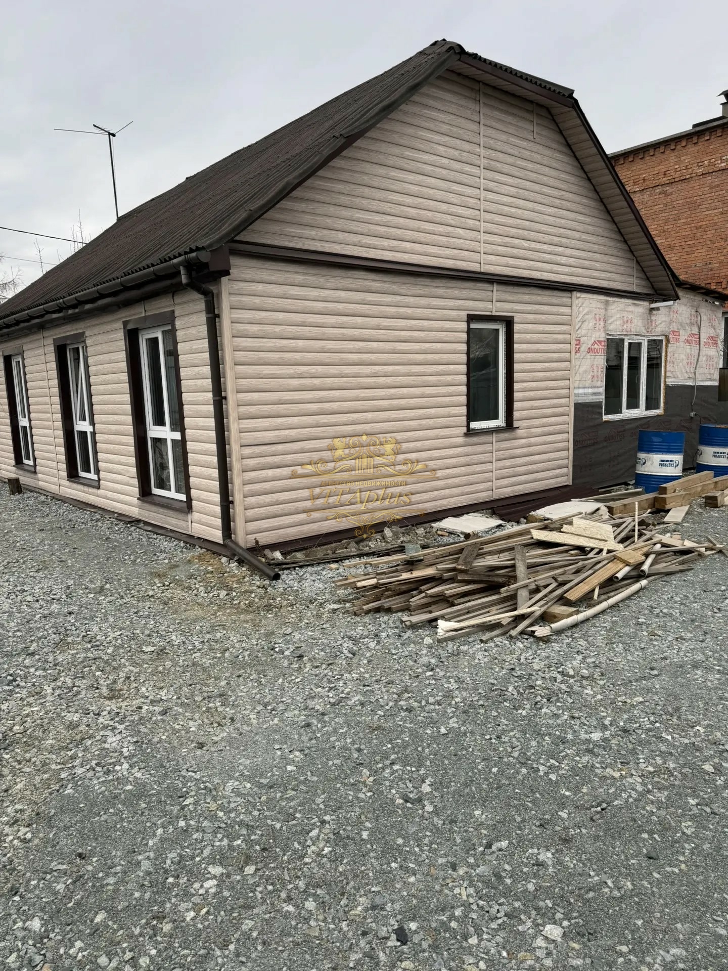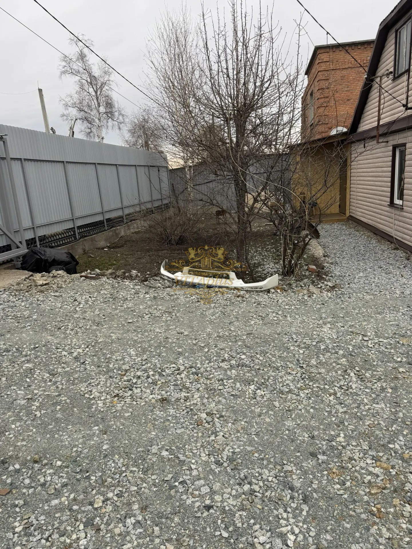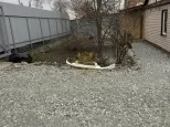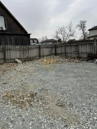 Участок 6 соток, категория земли — индивидуальное жилищное строительство (ИЖС). Территория отсыпана щебнем, установлены ворота, открытая парковка во дворе. Огорода нет, при желании участок можно благоустроить по своему вкусу.